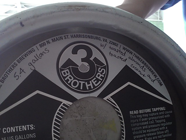 The other holds a special place in my own heart, as Harrisonburg’s Three Brothers Brewery allowed me to stop by a couple weeks ago and add a couple items to a firkin of their new Russian Imperial Stout. First off, a huge thanks to the guys at Three Brothers and Mr. Aden Short from P.A. Short Distributing, for the chance to help design a firkin – for Microfestivus no less – and potentially ruin some of the brewery’s street credibility going forward. (If the firkin doesn’t turn out, it’s all on me, fellas.) My choices for the stout? Toasted coconut and some toasted almonds. Here’s hoping it’s halfway drinkable.